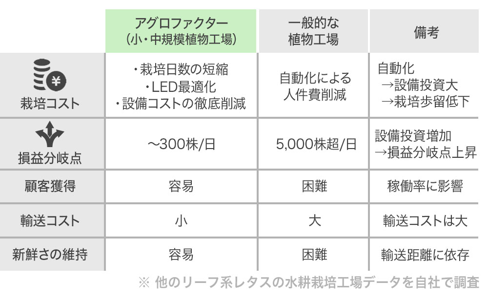 既存の植物工場は、1工場あたりの建設コストが多く掛かることから、大型の一拠点工場となる場合が多くなってしまいます。一方、弊社の場合、設備コストが抑えられることから、小・中規模の工場を各地に分散して建設するのに向いていると考えます。