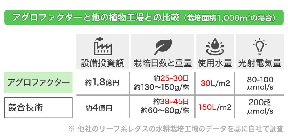 屋内で、水耕栽培を行う事業者は他にもありますが、他社との違いは、独自の栽培方法による成長の速さと大きさ、そしてコストの低さです。弊社は、自社開発のLED照明により、蛍光灯と比べ約60%の照射量で済むことと、栽培速度が速いため光を照射する時間も短く、節電にもつながります。