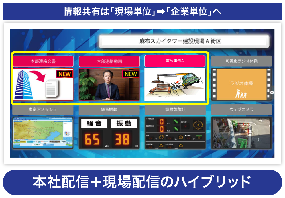 そこで、弊社は2つの機能を開発しました。1つは本社から現場へ配信される情報を「本社配信枠」として表示させ、従来の現場情報と共存共有する機能です。情報は自動的に更新表示されるため、閲覧ストレスなく全現場への一括配信を可能にしています。