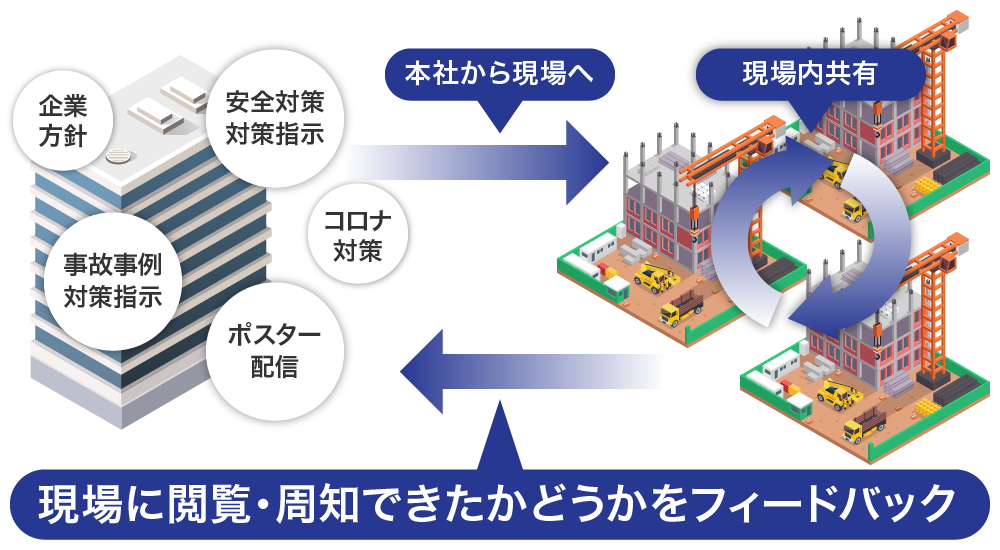 これにより、現場で発生した改善すべき事故事例と対策の共有や、企業方針文書や写真動画、URLなどを現場の運用情報を邪魔することなく全現場に一斉に周知することができ、各現場の足並みを揃えるだけでなく、作業員の士気向上にも貢献できると考えています。