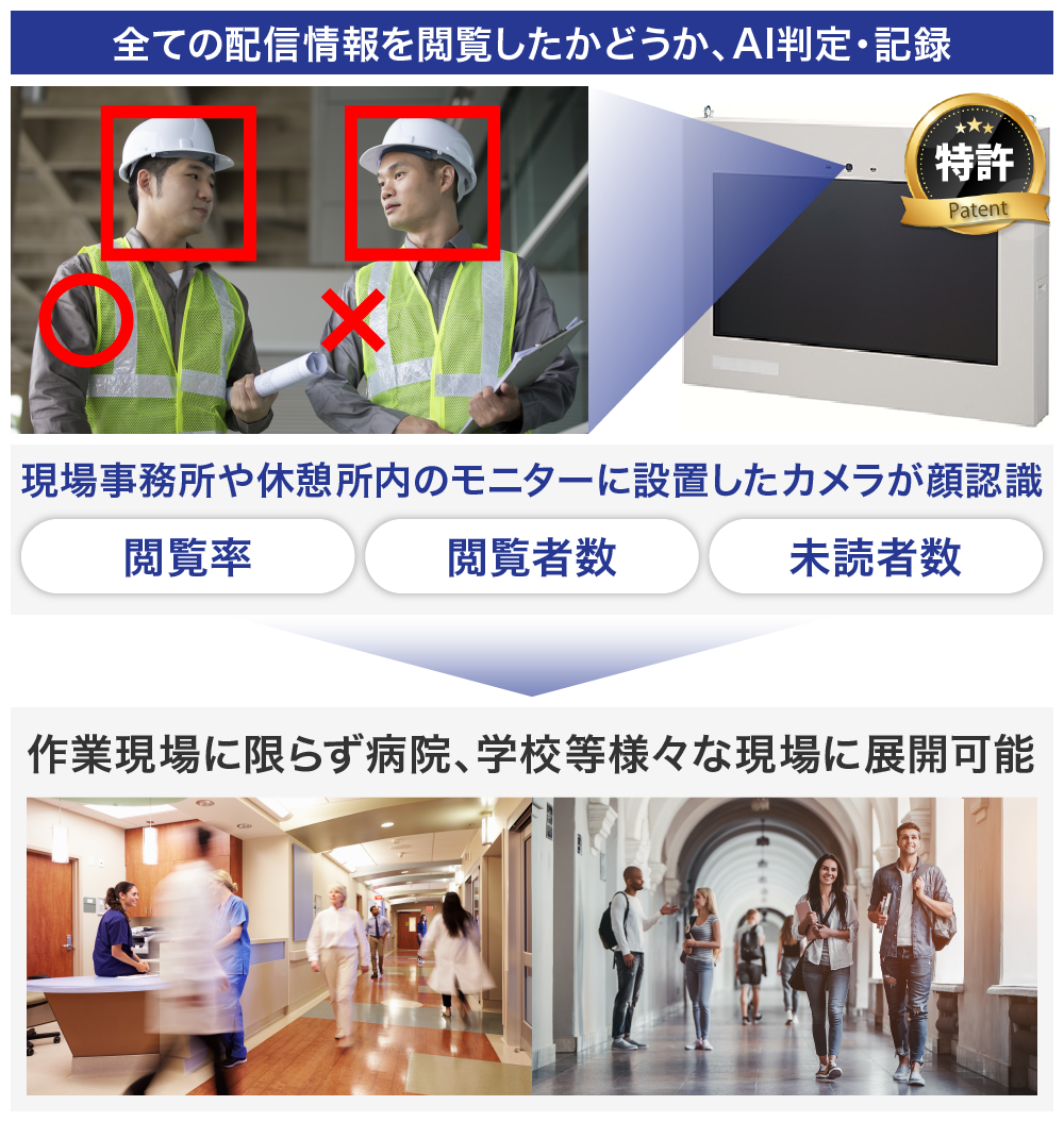 また、「作業現場に限定しない」かたちで既に特許を取得しているため、掲示物による情報配信を行っている現場、例えば教育機関や医療機関への横展開も見込んでいます。