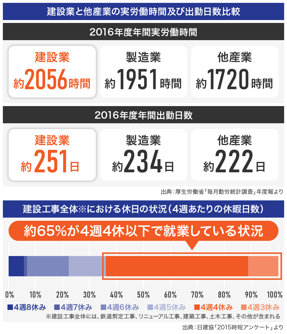 建設業界では、国の施策である36協定において適用までの猶予期間が与えられていましたが、2024年でその期間は終わり、労働時間の短縮は重要な課題となっています。