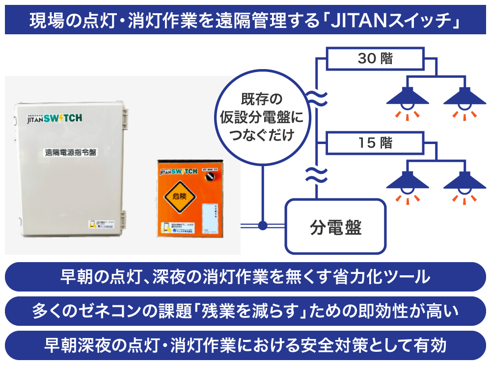 さらに、作業現場において不可欠な灯りの点灯・消灯作業を遠隔管理できる「JITANスイッチ」を今年3月にリリースし、残業時間削減に貢献しています。