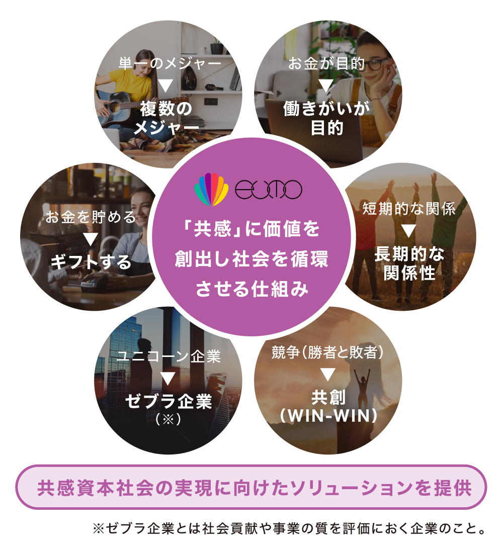 弊社は「共感資本社会の実現」へ向けて取り組みを行っています。「共感資本社会」とは、貨幣に換算できない「周囲の人からの“共感”」に価値を見出し、共感を資本として活動していける社会です。