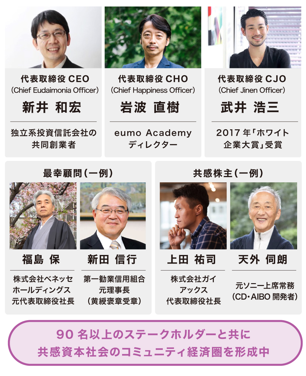 また、取締役や顧問には、リサ・パートナーズ、第一勧業信用組合、ベネッセコーポレーションなど第一線でご活躍され、経済を実際に動かしてきた方々が、経済を知り尽くした上で、今の経済のあり方に疑問を持ち、未来につながる経済の在り方を根本から変えようと知恵を集結して、教育事業(eumo Academy)、プラットフォーム事業(共感コミュニティ通貨「eumo(ë)」)を行っています。