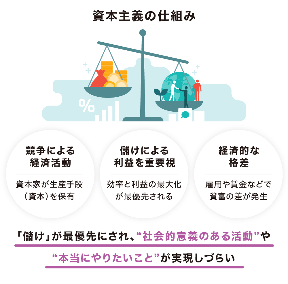 環境に配慮した商品やサービス、福祉や介護、貧困世帯の支援等の社会的に意義のある活動など、多くの人の共感を呼ぶ活動を行う人/行いたいと思う人は多くいます。しかし、効率と利益の最大化が最優先される資本主義社会では、これらの活動はなかなかビジネスとして成り立ちません。環境や社会への影響など考慮せずに利益を追求したほうが儲かるからです。