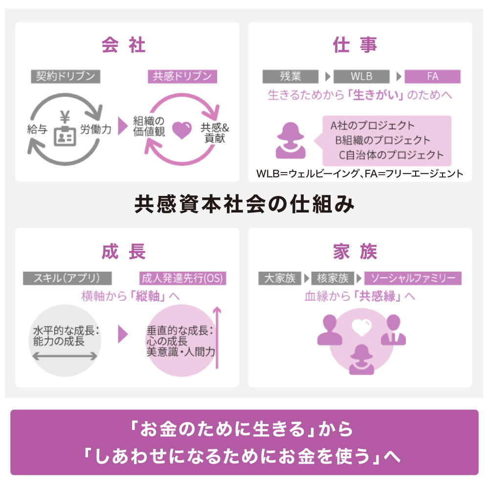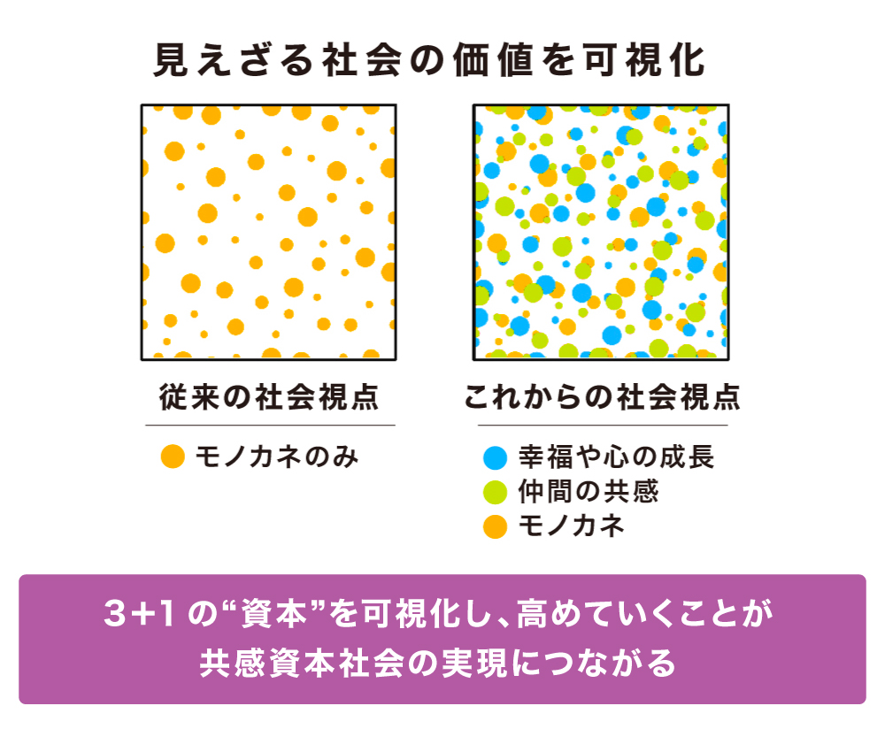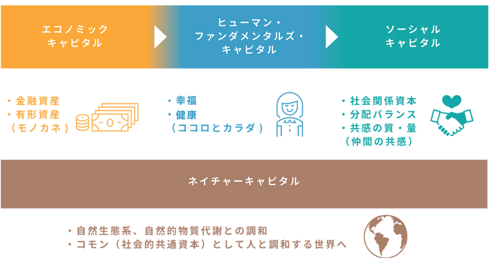 現状軽視されがちな3つの資本も大切にしていこうというのが、共感資本社会の基本的な考え方です。