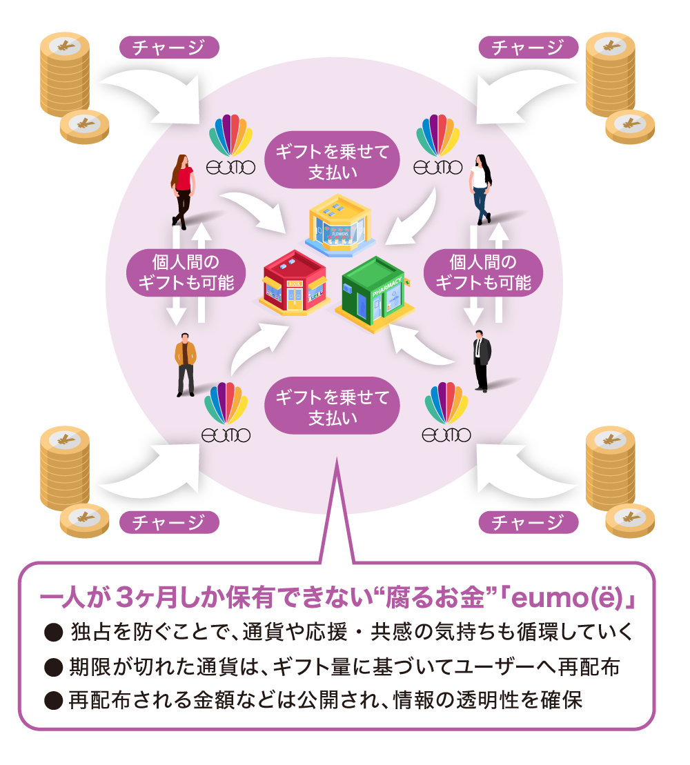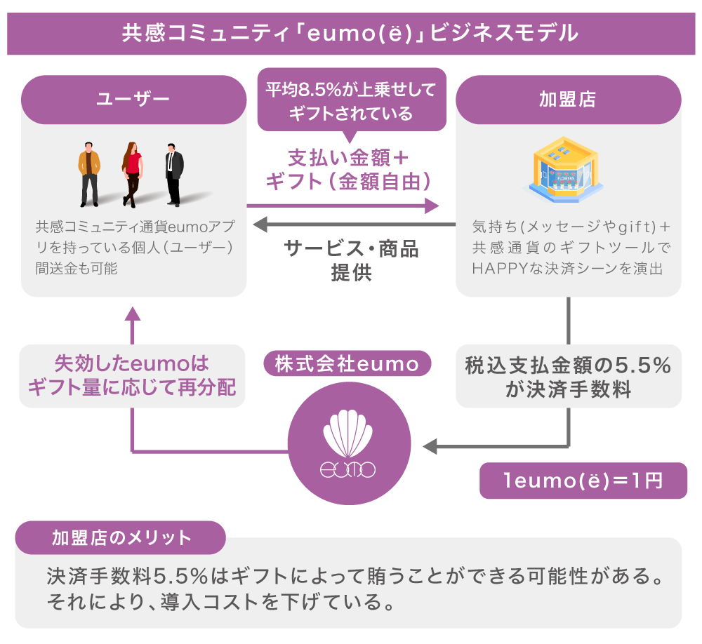 また、期限切れで失効した「eumo(ë)」は一旦弊社の退蔵益収益として計上され、ユーザーと加盟店に分配されます。分配された後に再度失効した場合は、再分配せず弊社の収益となります。