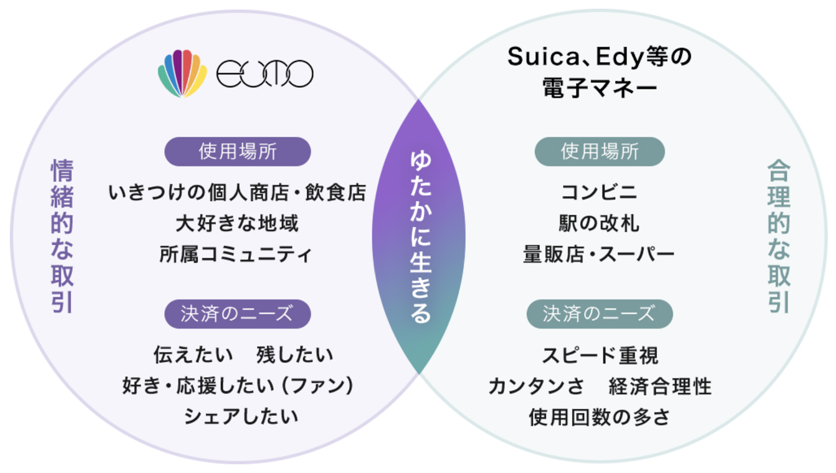 弊社が提供する、共感コミュニティ通貨「eumo(ë)」は、一般的な電子マネーと同じように加盟店での支払いに使うことができます。違うのは、使用期限が3ヶ月しかないことと、共感の気持ちを上乗せして支払えることです。
