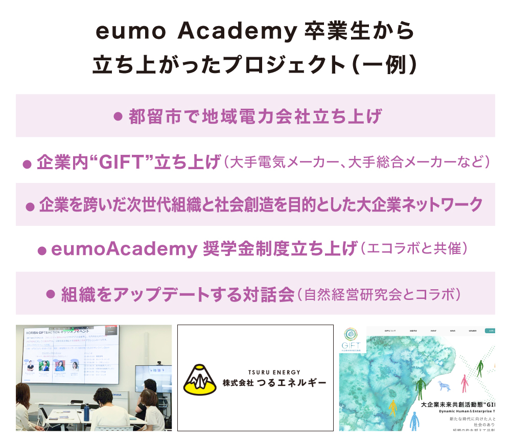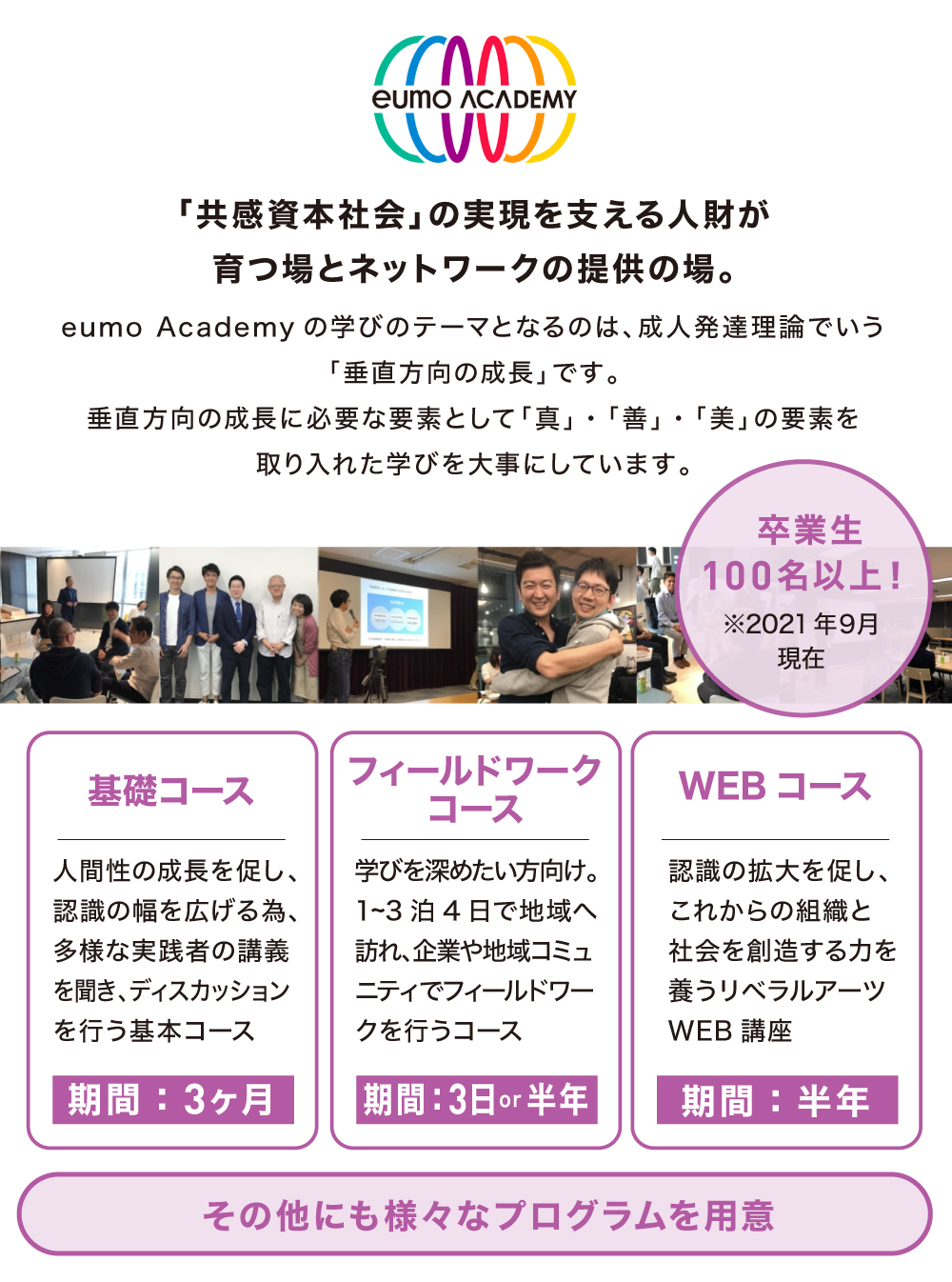 弊社は、共感資本社会を共に作っていく人材を育成し、共感に価値を見出す世界観を広めるため、教育事業「eumo Academy(ユーモアカデミー)」を運営しています。コミュニティ通貨「eumo(ë)」を使うことによって共感資本社会の世界観に共感する仲間が増えるのと同様に、世界観を共有する仲間と共創できるネットワークを提供する場でもあります。