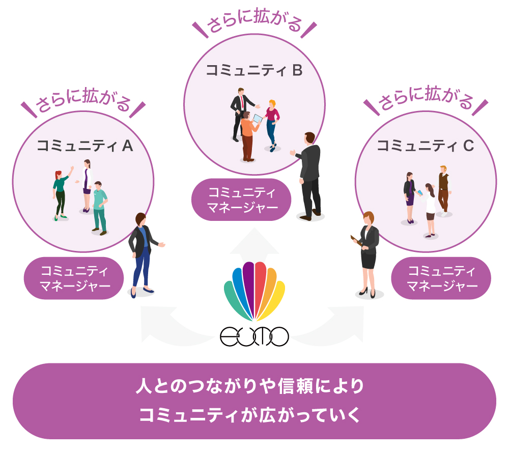 共感資本社会の実現のために重要なのは、やはり共感してくれる仲間を増やしていくことです。「eumo(ë)」を使って共感してくれた方がコミュニティマネージャーとなって独自通貨を作り、そこで獲得したユーザーがまた共感をして仲間を増やすといった自然な広がりを目指しています。