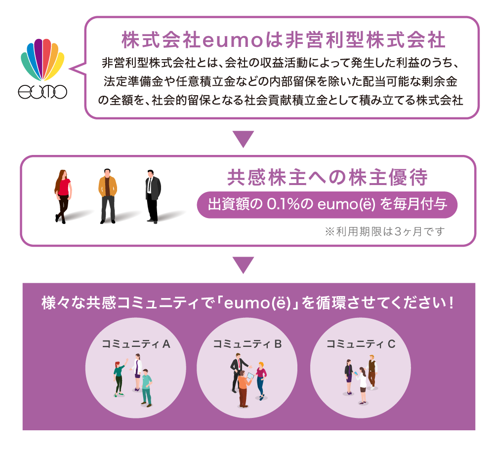 出資額の0.1%相当のコミュニティ通貨「eumo(ë)」を毎月付与