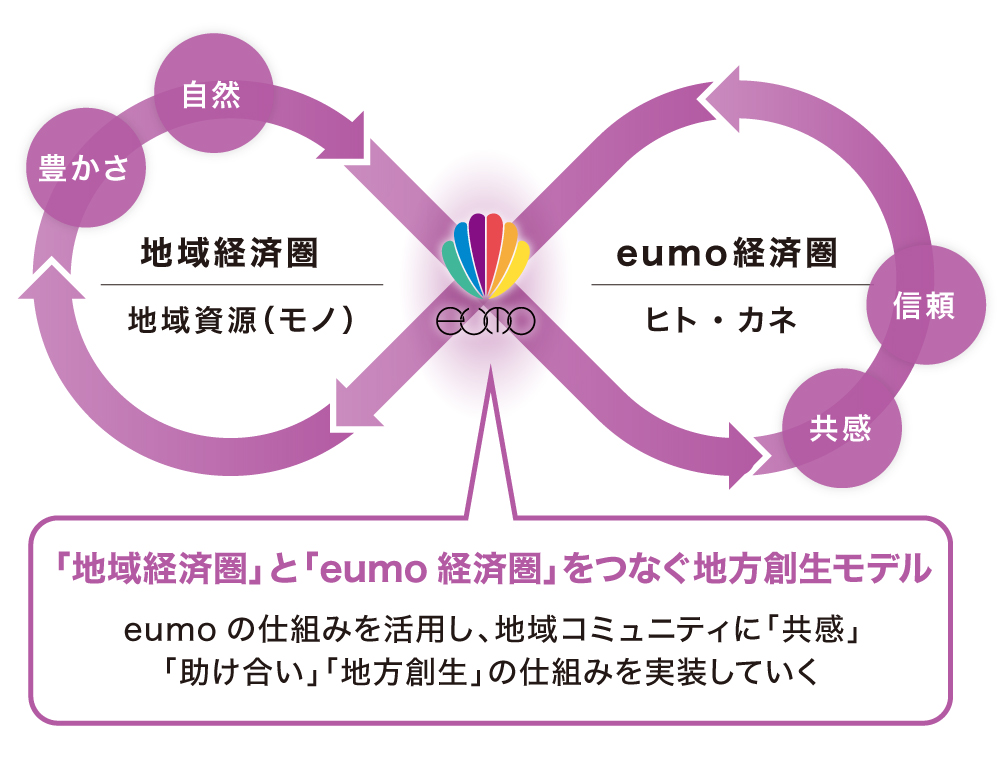 その事例が助け合いの循環経済の成功事例として、SDGsや地方創生などの文脈で注目されるようになり、eumo経済圏が自然と広がっていく事を目指します。