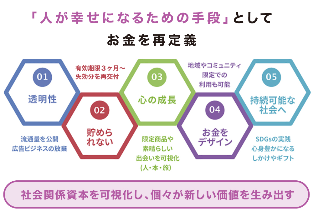 そのために、共感をベースにしたコミュニティ通貨事業と、共感資本社会を実現するための人材を育成する教育事業をメインに展開しています。