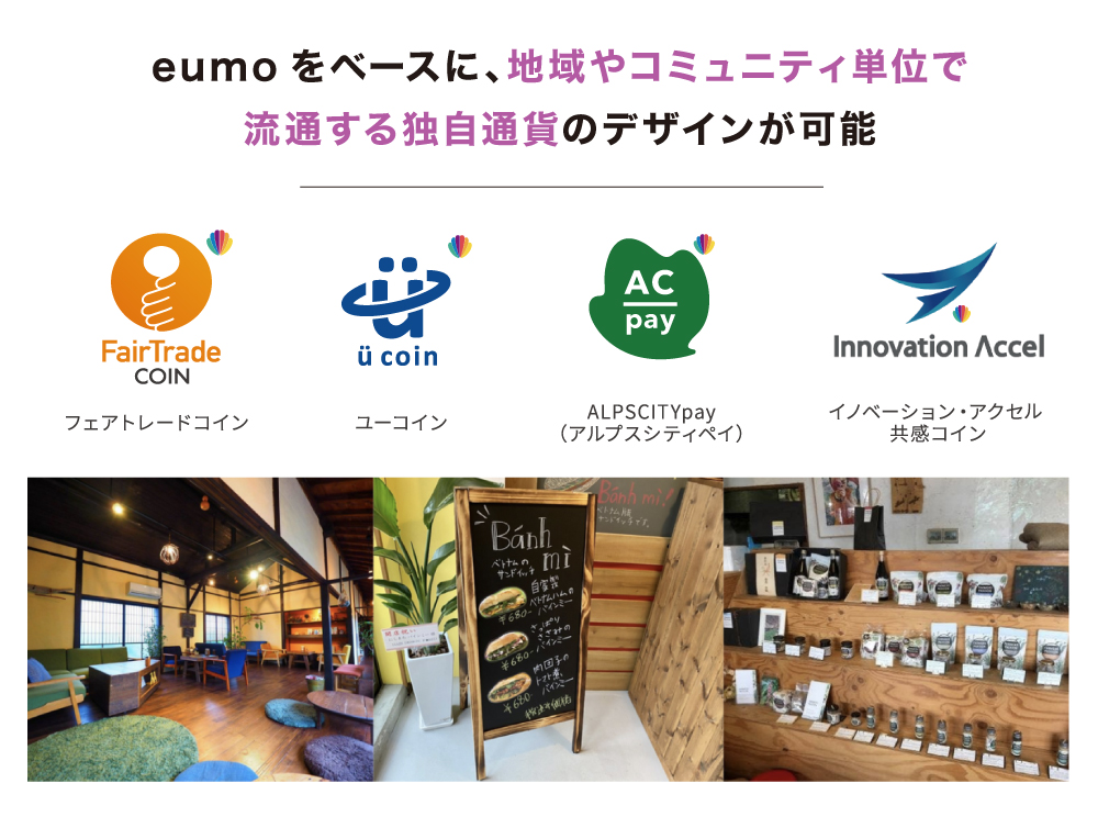 また、当プラットフォームでは、「eumo(ë)」から派生した新しいコミュニティ通貨を作ることもできます。フェアトレードやエシカルな想いを持った店舗で使える「フェアトレードコイン」や、長野県松本市を中心とした地域コミュニティの「ALPSCITY pay」等、さまざまな通貨が生まれています。