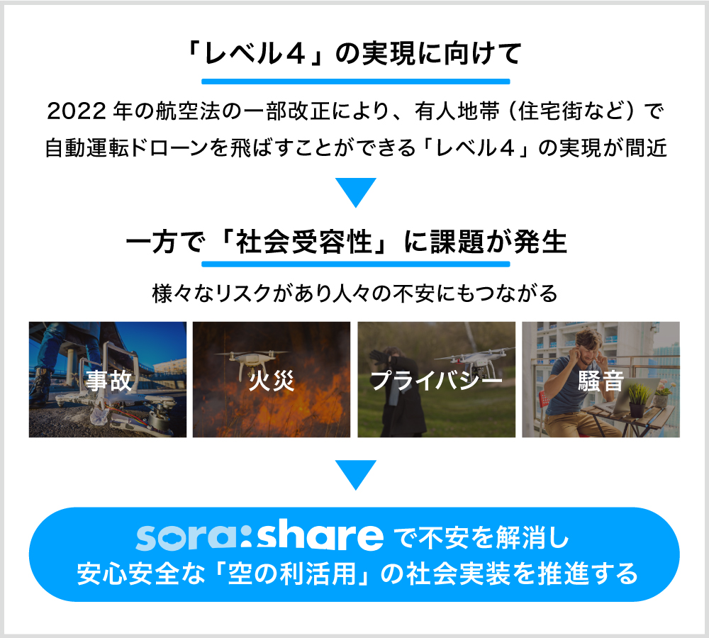 ドローン産業はここ数年で急成長し、2022年には航空法が一部改正され「有人地帯の第三者上空目視外飛行(レベル4)」が可能になる予定です。ドローンを飛ばすにあたり、技術的課題や制度的課題は業界全体の努力により解決してきましたが、これまであまり議論されてこなかったのが「社会受容性」の問題です。
