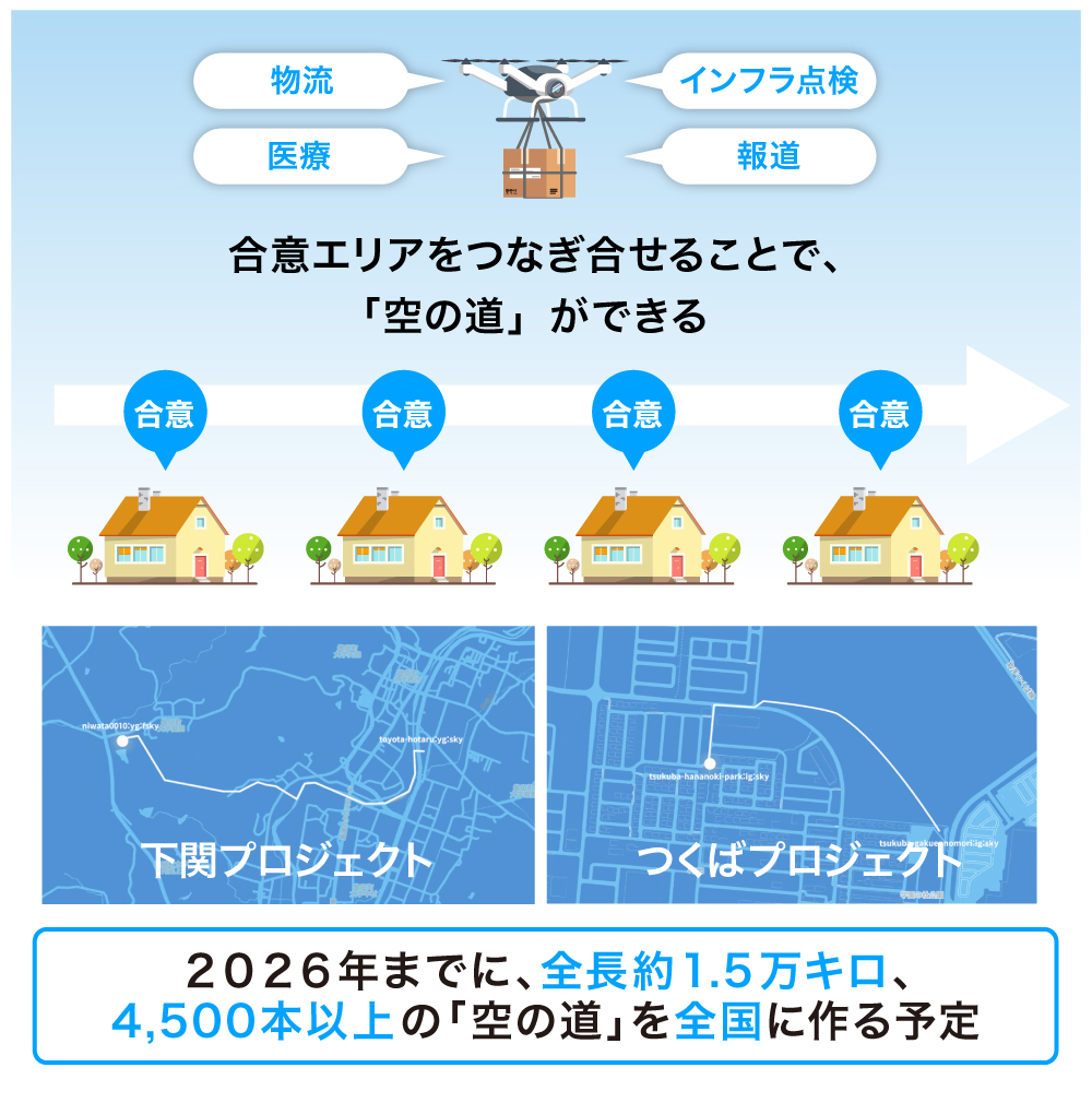また、鉄道、電力会社、高速道路会社など線のインフラを持つ企業は、インフラ建設の際に必要な地域との調整業務についてのノウハウを蓄積しています。今後は、これらのインフラ企業と連携を検討し、「空の道」の交通網を広げていくことを計画しています。