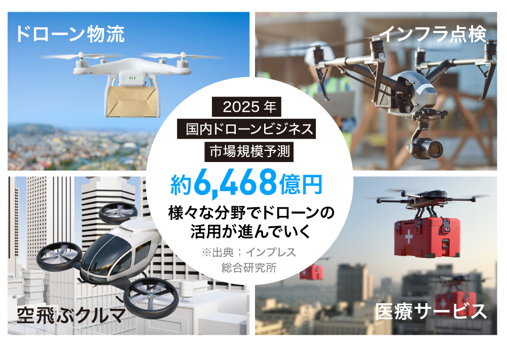 ここ数年で大きく成長したドローン産業は、今後もさらなる発展が期待される分野です。既に実用化されている空撮や農薬散布、災害調査、インフラ点検等に加え、物流やセキュリティ、都市データ収集、空飛ぶクルマなど新たな活用の可能性が広がります。