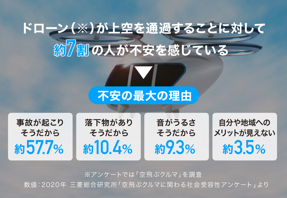 実際に、約6.5万人を対象に行われたアンケート調査では、7割以上の人が「空飛ぶクルマ(ドローンの一種)」が上空を通過することに対して「やや不安がある」「不安がある」または「反対である」との回答が集まりました。