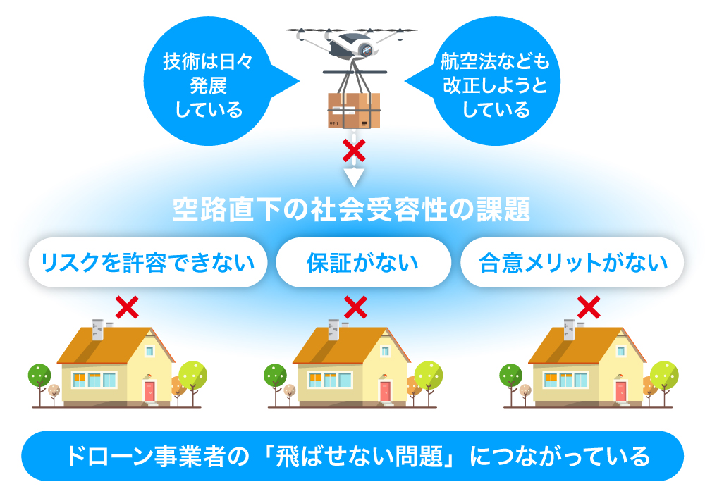 一方で、ドローン事業は機体の性能や可能性に目が行きがちで、航路の安全やその下で生活する人々についてはあまり議論されてきませんでした。どんなに機体の性能が上がっても社会に受け入れられなければ、産業としての発展が進みません。高頻度・高密度に使用される「空の道直下」で暮らす人々は、事故や騒音、プライバシーの侵害などのいわゆる「空害」問題に直面することになるのです。