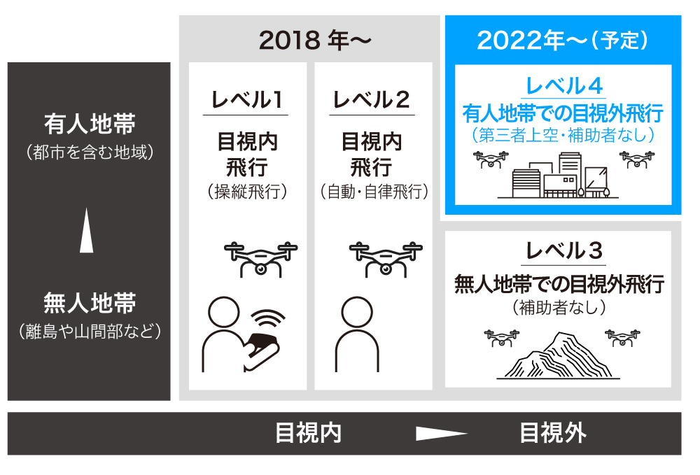 2022年には航空法の一部改正により、ドローンの利活用段階レベル4である「有人地帯の第三者上空目視外飛行」が可能になる予定です(操縦者ライセンス、機体認証制度を設けることで実現)。そうなれば、有人地帯の上空にてLTE電波等を利用し、補助者なしでドローンを飛ばせるようになります。