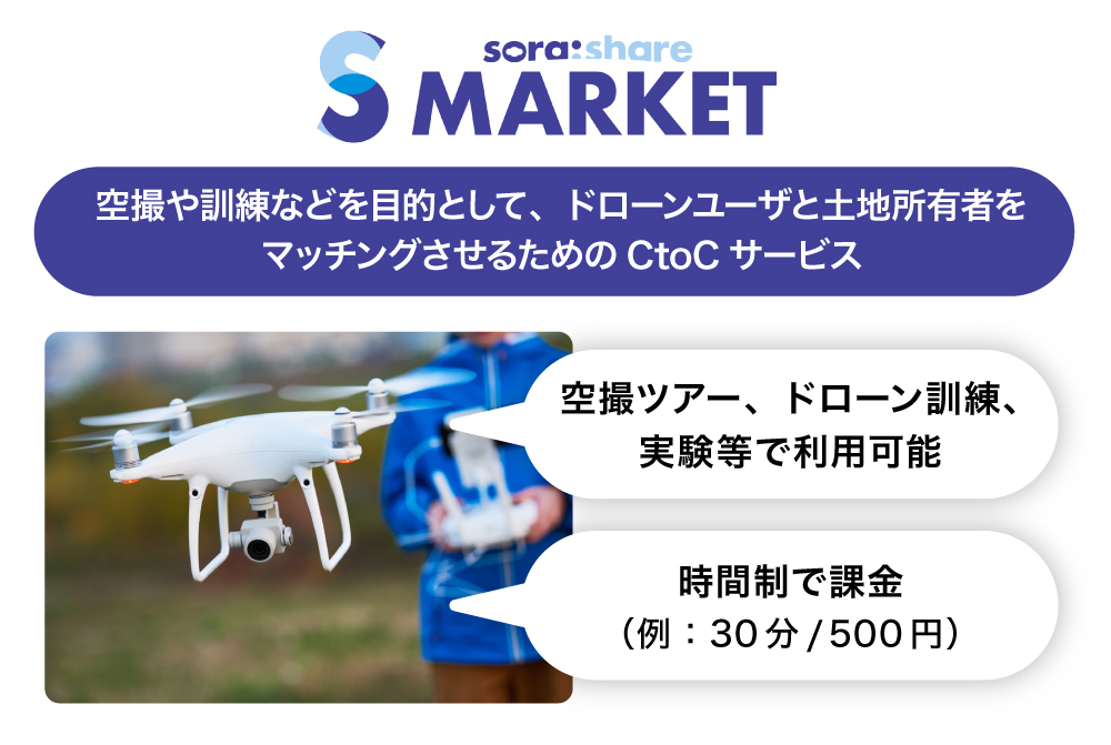 ドローン飛行に不安はあっても、メリットがあるならば合意したいという方もいるはずです。「ソラシェア」では、土地所有者に対してインセンティブを付与する仕組み「S:MARKET(スカイマーケット)」と「S:ROAD(スカイロード)」の用意を進めています。「スカイマーケット」はすでに展開し、「スカイロード」はサービス化に向けて準備中です。