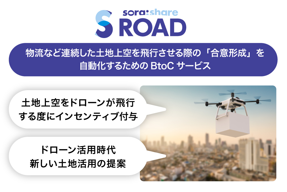 その動きに合わせて、ドローン機体選定やライセンス取得などの必須ノウハウを取りまとめ、安心安全な空の利活用を推進するためのビジネスモデルを構築することを目指します。空路を設定する際に必要な地域の社会受容性向上の仕組み「ソラシェア」登録数を増やし、ドローン航行支援事業「Sky Road」をサービス化していくことを計画しています。