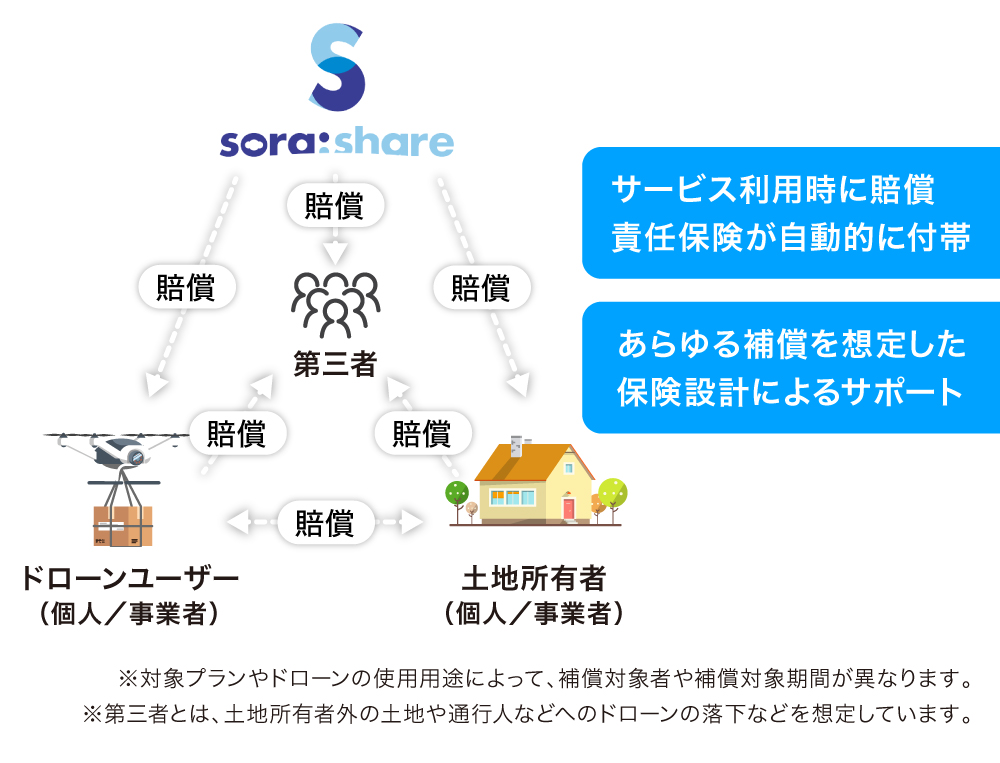 プランによってはドローンユーザーだけではなく土地所有者やプラットフォームである弊社も補償対象となります。