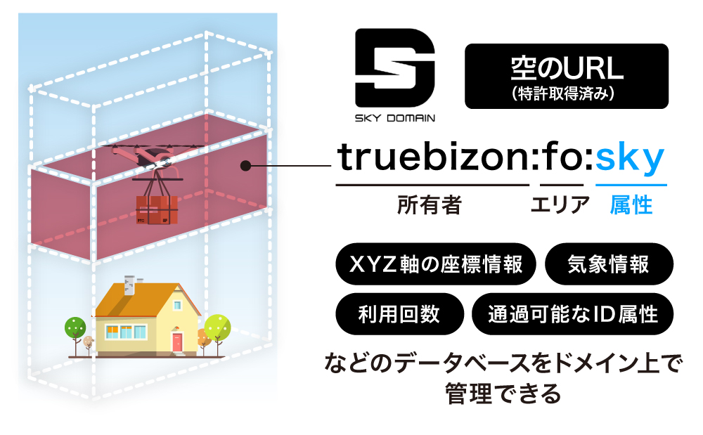 空に「住所」を作り、空域に関する情報データベースと紐づける技術が「スカイドメイン®︎」です。「ソラシェア」のサービスの基礎となっており、特許を取得しています。