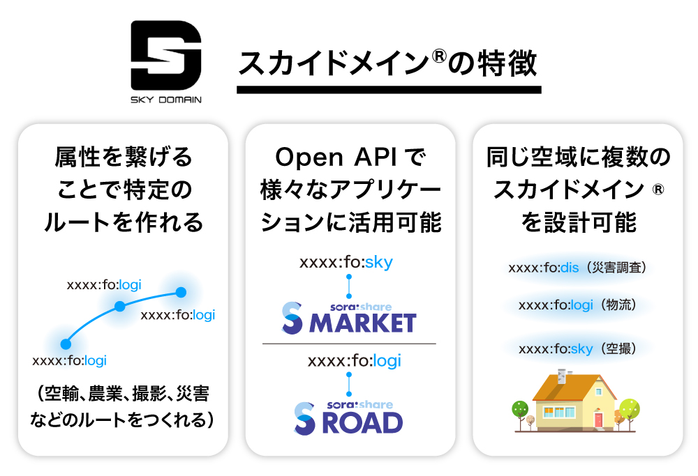 「属性」には空域の基本情報を示す「:sky」をはじめ、空輸ルートを示す「:logi」や農薬散布ルートを示す「:agr」など、用途によって様々な種類があります。インターネットのドメインと同様、今後利活用が進めば新たな属性を追加することもできます。