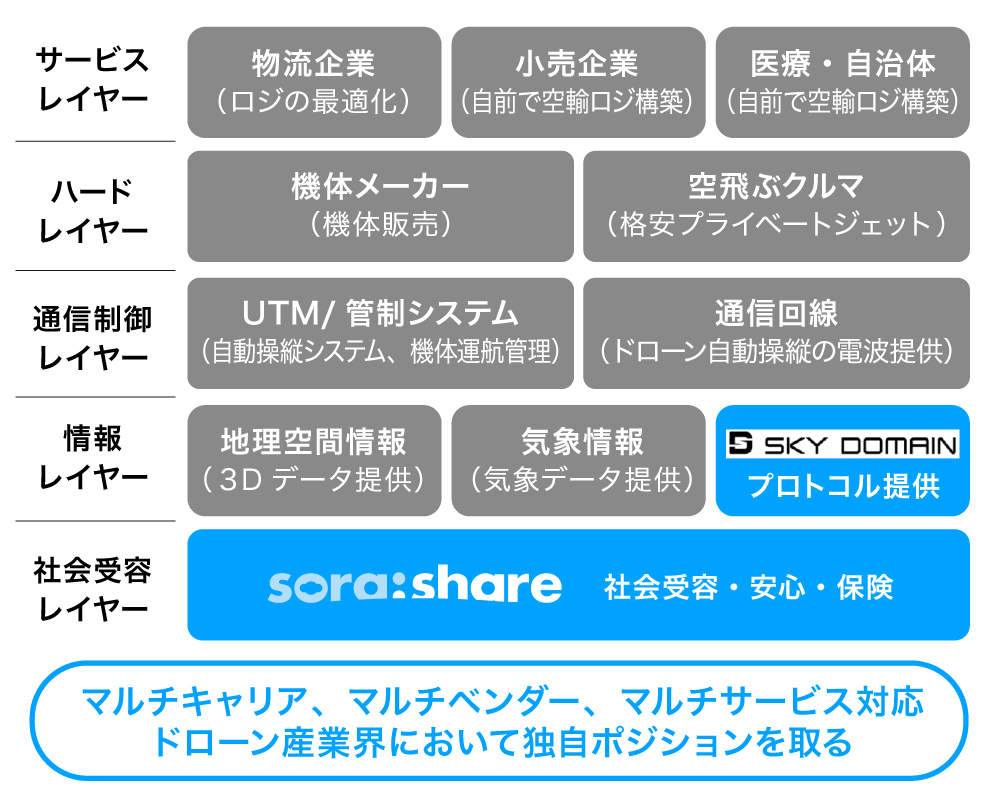 ドローンビジネスにおけるプレイヤーは、機体開発、通信開発など、様々なレイヤーが存在しますが、弊社が新たにポジショニングを置くのが「社会受容レイヤー」です。これらは未だ競合が少ない領域であり、弊社がビジネスモデル特許も取得しているため、サービス開発はもちろん、登録者獲得においても非常に高い参入障壁が存在します。