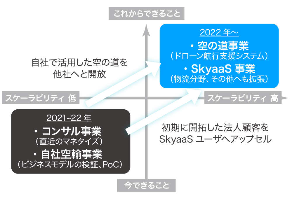 2022年の「レベル4」開始までは、補助なしでの第三者上空飛行ができないため、その間はドローン利活用のコンサルティング、及び実験的なドローン空輸実施でノウハウを蓄積します。