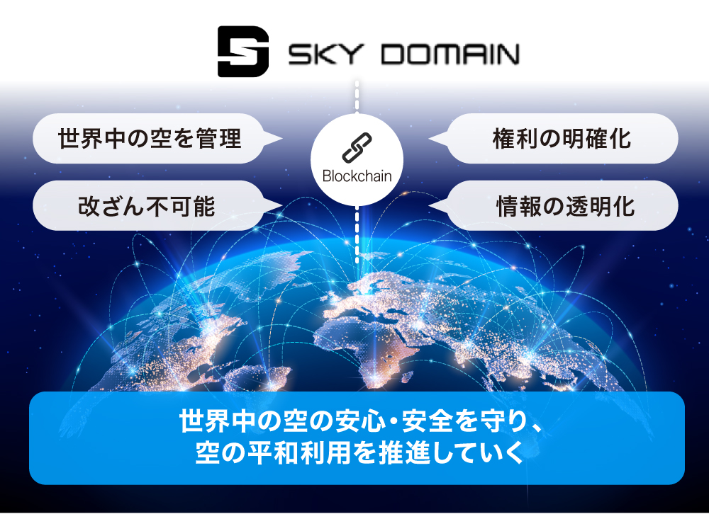 そして、将来的には「スカイドメイン®︎」に紐づくデータベースをブロックチェーンで管理する構想もあります。誰がいつどの空域でドローンを飛ばしたか、その正確な情報を記録し、履歴に基づいたセキュリティ管理や、インセンティブ付与を暗号通貨で自動・確実に行うなど、様々な可能性を検討しています。空の利活用をブロックチェーン技術で透明化することにより、空の平和利用を推進するのです。
