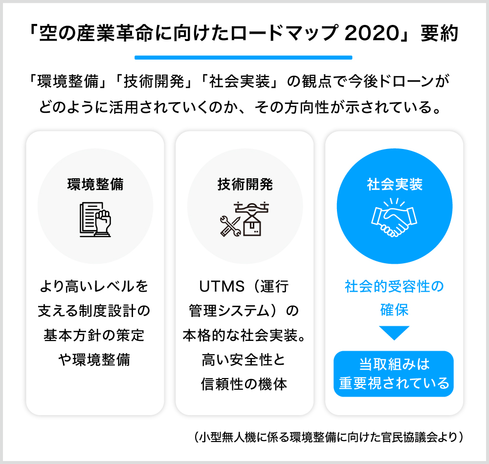 一方で、それまでに、ドローン産業が社会に受け入れられる土台を作る必要があります。それに伴い、ドローンの社会受容性について政府の明確な立ち位置が示されました。