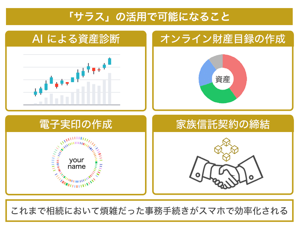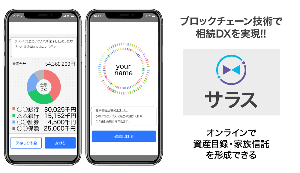 「サラス」は、スマホで預金通帳や有価証券の写真を撮るだけで自身の財産目録が生成されるほか、独自のブロックチェーン技術で法的効力のある電子実印を発行、その実印を使って財産目録に記載された財産を家族へ継承するための家族信託契約の締結までを、スマホのみで完結できるオンライン資産管理(終活ナビ)サービスです。