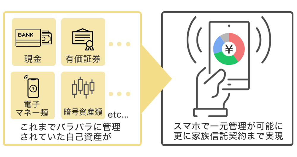 また、登録資産状況によって相続のリスク診断を行い、利用者へアドバイスするAIコンシェルジュ機能と合わせることで自分の資産を守ります。これらの財産管理機能を原則無料で提供する予定です。
