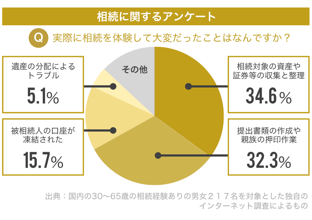 相続の問題とは?と聞くと「遺産の分配」を思い浮かべる方も多いと思います。しかし、弊社が実施した「アンケート調査(N=217)」によると、最も問題となっているのが「相続対象の資産や証券等の収集と整理」で34.6%。次いで「書類の作成や押印作業」が32.3%でした。「遺産の分配でトラブルになった」人はわずか5.1%に過ぎませんでした。