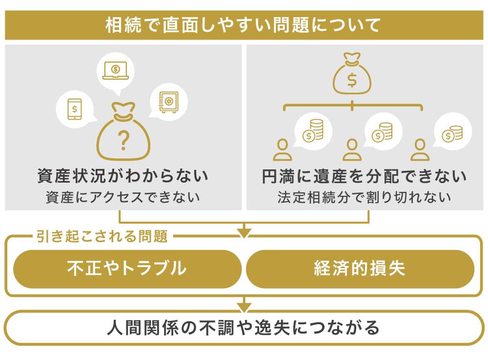 資産の存在がわからない、アクセスできないというデジタル資産ならではのリスクは、相続問題に直結すると考えられます。