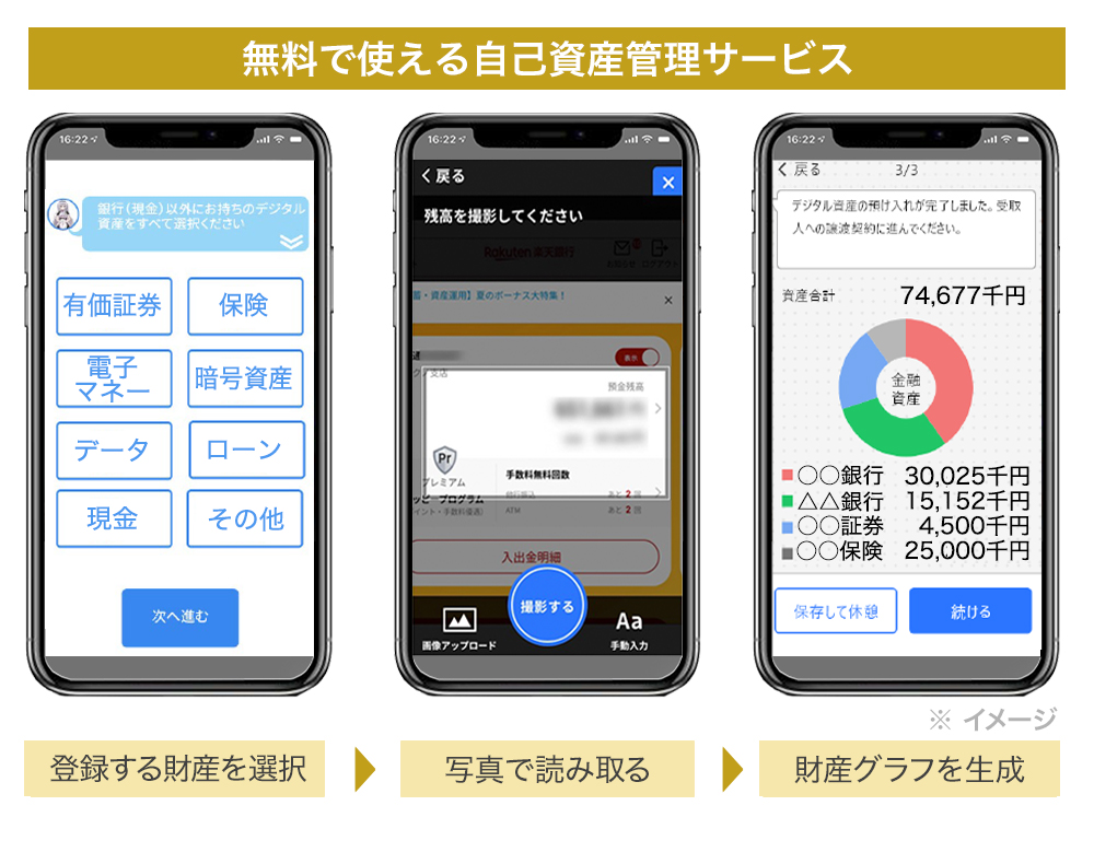 ご自身名義の銀行預金、証券、電子マネー等の金融資産、写真や動画、家族へしたためた手紙などの想い出の資産を、スマホで写真撮影するだけで、AIが自動的に財産目録を生成します。