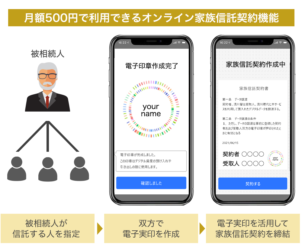 2つ目は、財産目録に記載された資産を、指定人に継承する家族信託契約サービスです。ご自身に万が一の事態が発生したときに、財産を管理してほしい「受託者」を指名し、スマホ(オンライン)上で財産信託契約を締結できる機能です。