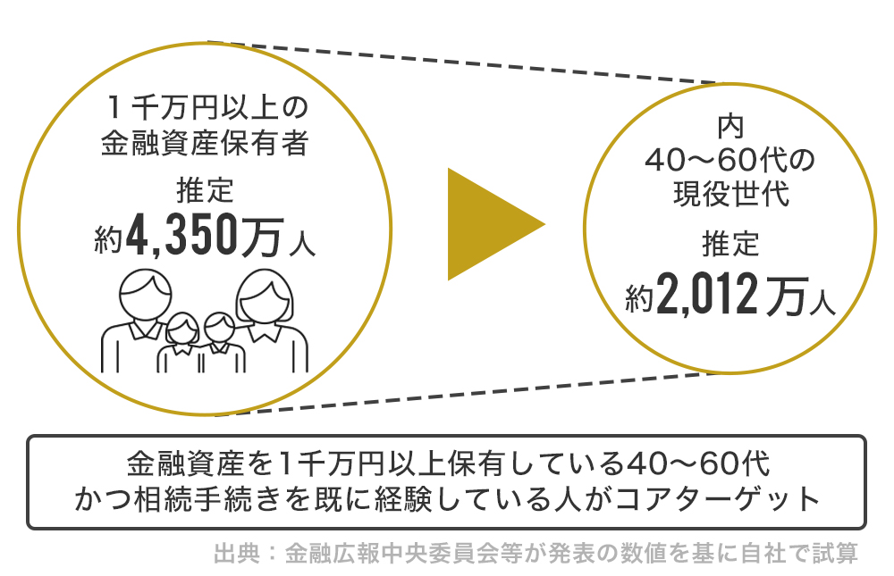 具体的には、金融資産が1千万円以上ある層としており、国内の潜在的な市場規模は約4,350万人と想定しています。そのうち、40〜60代の現役世代が弊社のコアターゲットで約2,012万人存在すると推測しています(出典:金融広報中央委員会等)。