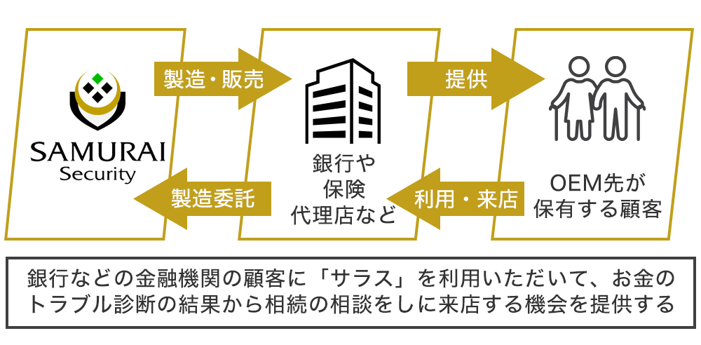 自社でサービスを提供する一方で、相続ビジネスへのニーズが大きい地方金融機関を対象に「サラス」をOEM提供するライセンス型ビジネスモデルも進行中です。