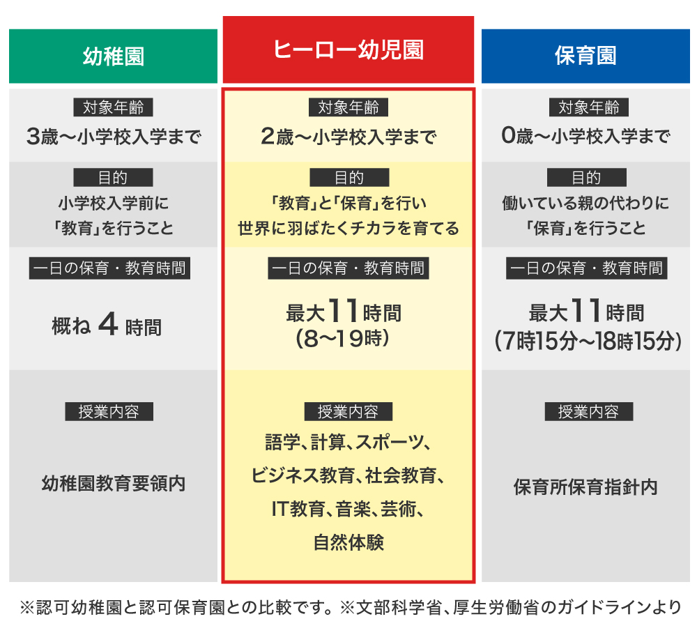 弊社が運営する「ヒーロー幼児園」は、東京都が定める認可外保育施設です。幼稚園、保育園、スポーツ教室、学習教室、自然体験教室をかけ合わせた新しい教育施設という意味で「幼児園」という造語を使っています。「ヒーローを育てるオールラウンドな教育」という独自な教育方針を実現するため、あえて認可“外”という形を取りました。