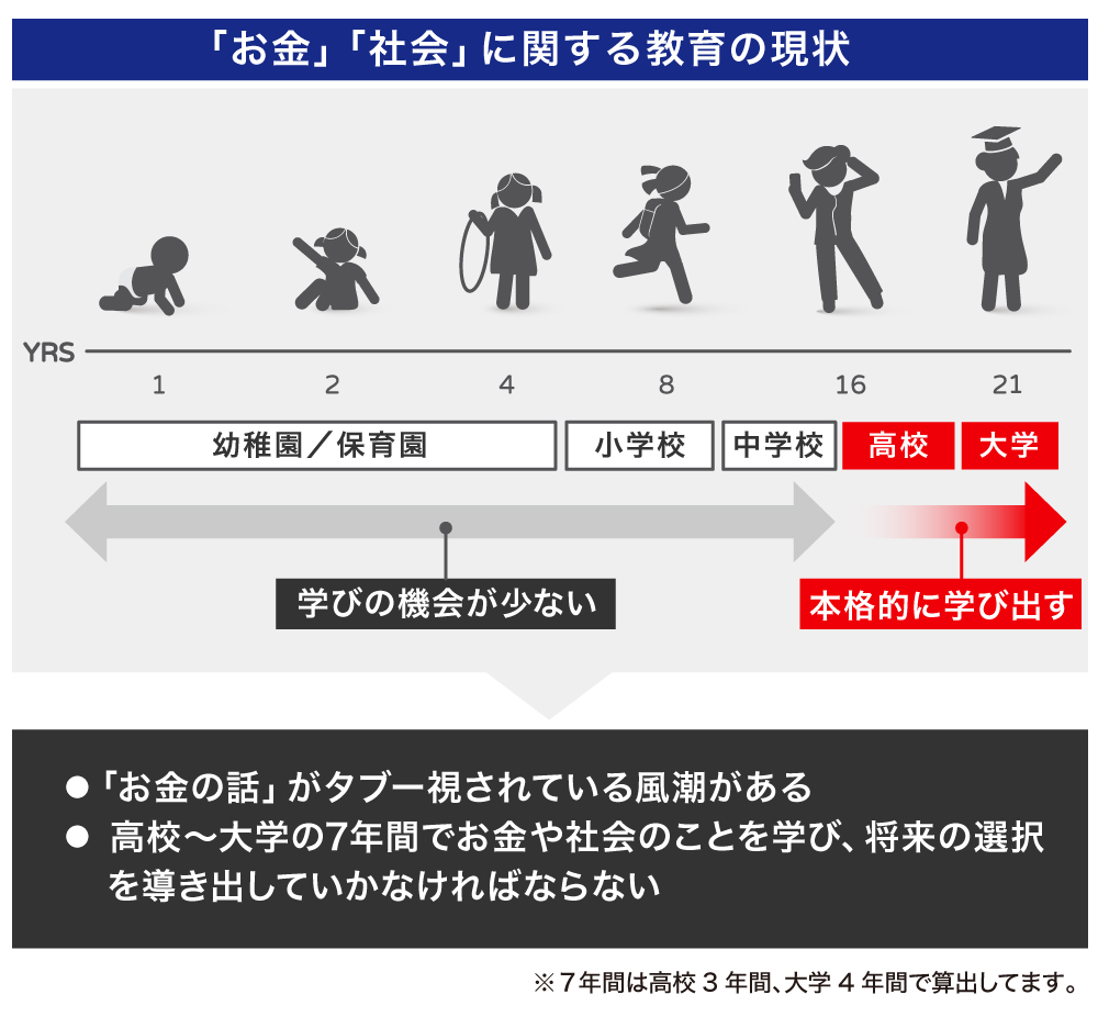 しかし、資本主義の社会はお金で動いています。子供達が大人になり、社会で仕事をしていく上で、お金と無縁ではいられません。にも拘わらず、多くの子供達は高校や大学からお金のことをやっと学び出し、その後、7年ほどで社会に出なくてはなりません。