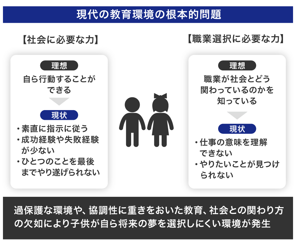 また、「社会」や「仕事」についての教育も十分ではありません。大人は子供によく「将来の夢は?」と聞きますが、社会について教えられていない子供達が知っている職種は限られており、プロスポーツ選手や警察官、YouTuber等、子供でも目につきやすい職業です。