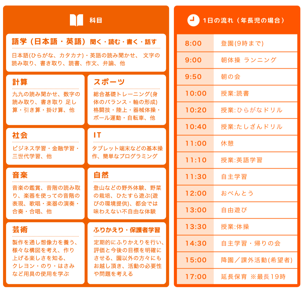 教育内容は幅広く、「語学(日本語・英語)」「計算」「スポーツ」「ビジネス教育」「社会教育」「IT教育」「音楽」「自然体験」「芸術」をカバーしています。