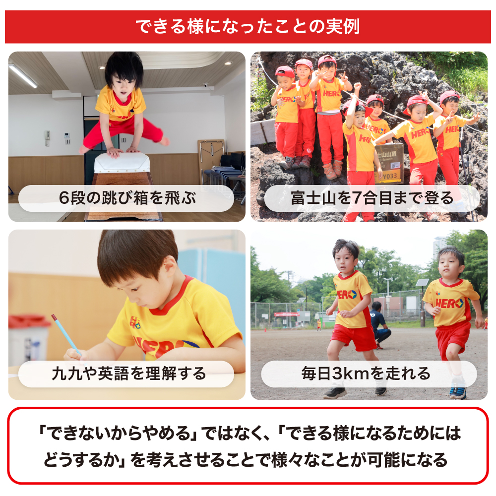 弊社の運営する「ヒーロー幼児園」は、『やればできる』の考えを基に語学や計算・スポーツ・社会教育・ビジネスをはじめとしたオールラウンドな教育を通し、夢を持ち、自ら考え、決断実行できる人間力を育て、世界で活躍する「ヒーロー」の育成に取り組んでいます。