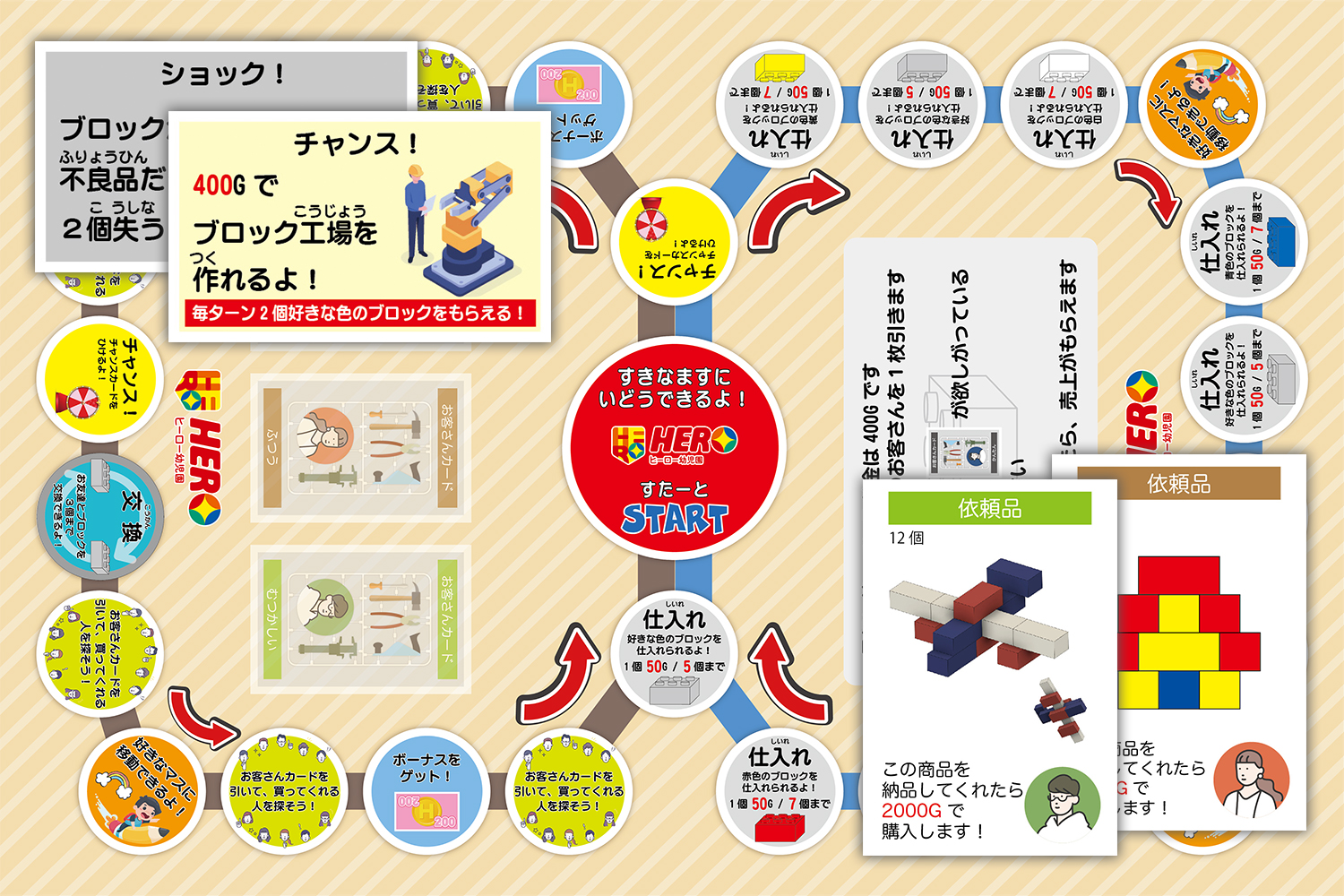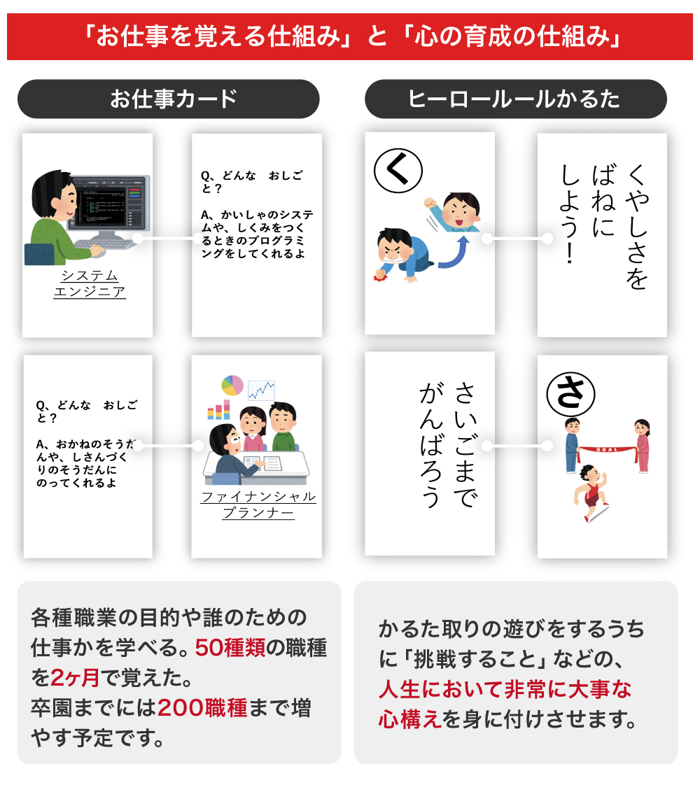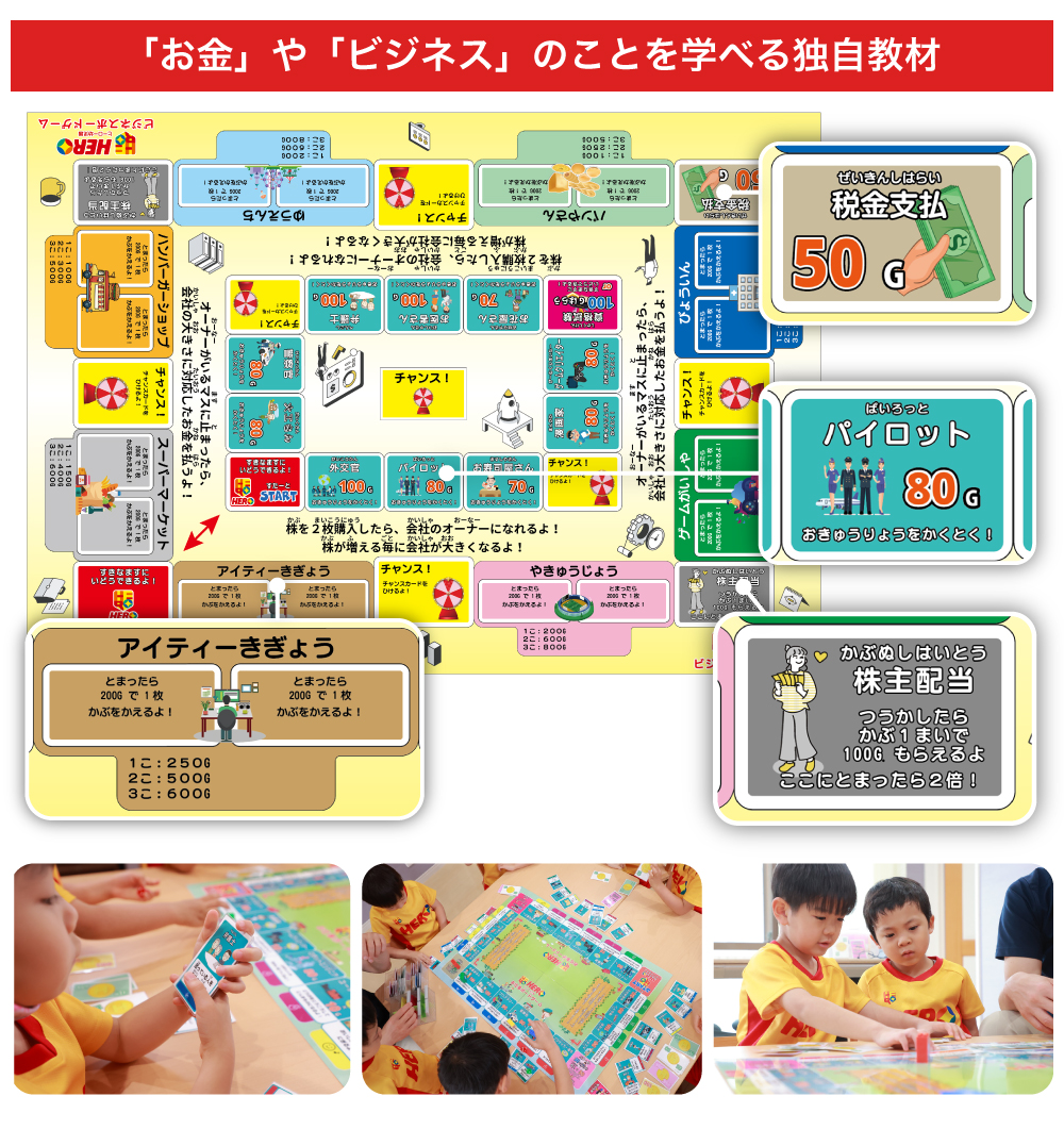 子供達が楽しみながら学習できるよう、オリジナルの「お仕事ボードゲーム」や「ヒーロールールかるた」等、独自の教材を開発・活用しています。