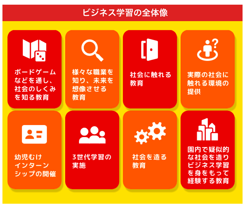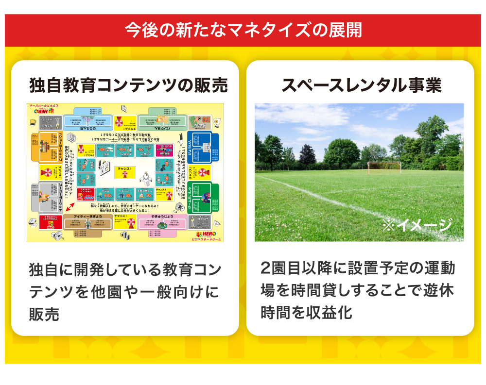 また、今後は園児への授業で使用する教育コンテンツ(ボードゲーム等)の販売や、施設の営業時間外の場所貸しなどでも収益の幅を広げていく考えです。