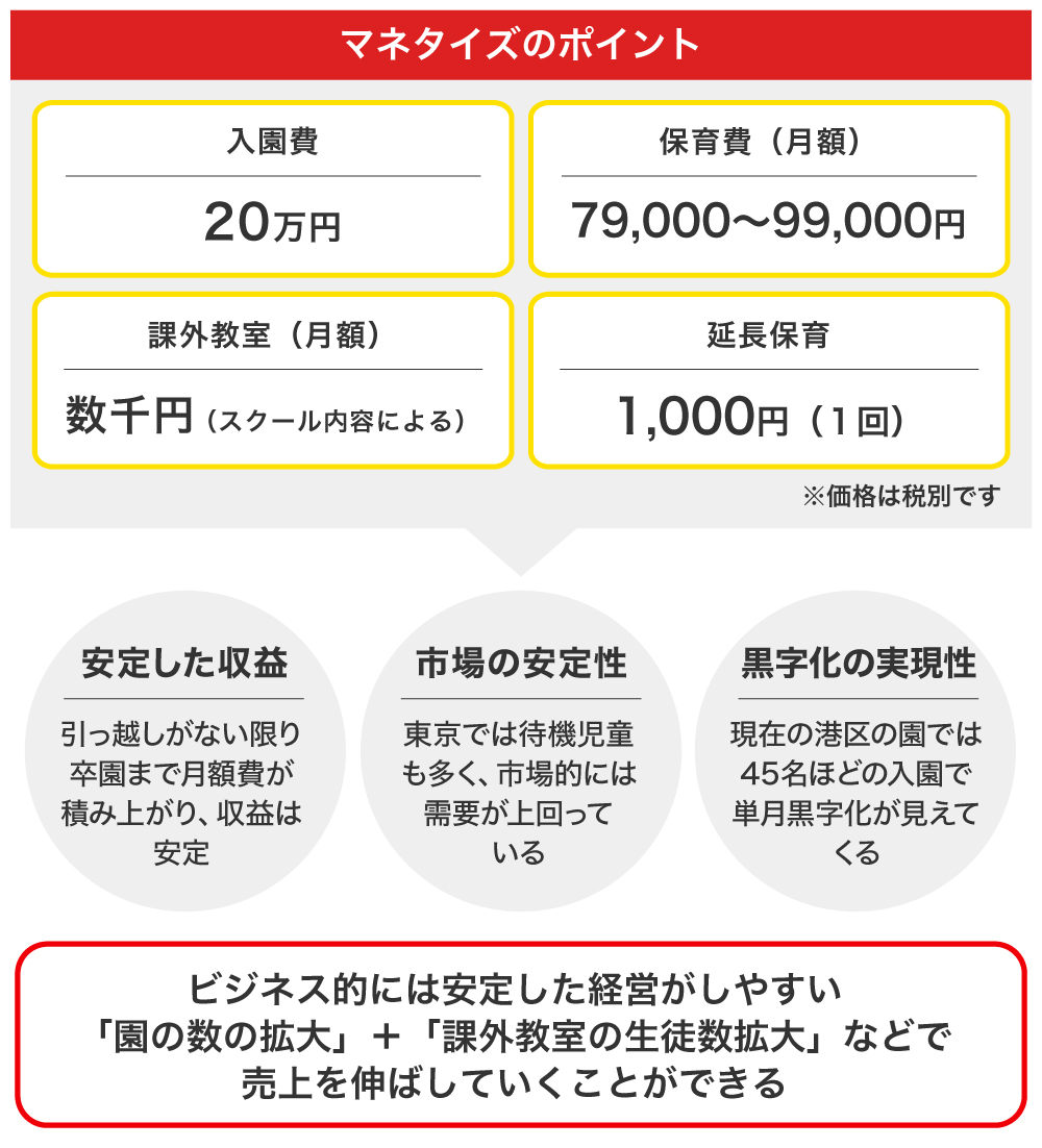 月額79,000円~(週5日、預かり時間により異なる)の授業料がメインの収益となります。一般的な保育園と比べると高額に感じられるかもしれませんが、国や自治体からの補助を受けられるので実際の負担は大きくありません。